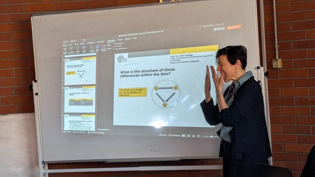 Проф. др Жули Кастеш (Julie Casteigt), професорка на Катедри за философске основе теологије, Факултета католичке теологије, Универзитета у Регензбургу, одржала је 13. 3. 2026. предавање на Православном богословском факултету, Универзитета у Београду. Тема излагања била је посвећена тумачењу Пролога Еванђеља по Јовану у делу Алберта Великог, са посебним освртом на тријадологију и лингвистичко-философске претпоставке говора о Богу.